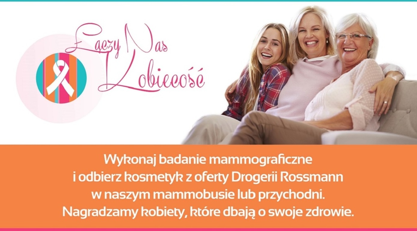 „Łączy Nas Kobiecość" to 6 edycja ogólnopolskiej akcji profilaktyki raka piersi. Weź udział w akcji i wykonaj badanie mammograficzne, a otrzymasz prezent w postaci kosmetyku z oferty drogerii Rossmann.