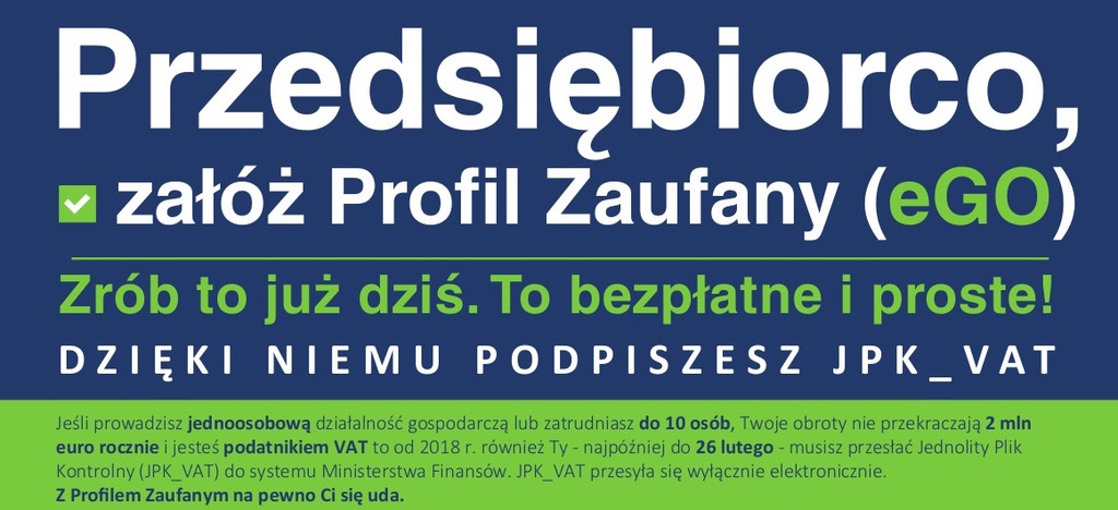 Jeżeli przedsiębiorcy już teraz założą Profil Zaufany będą dobrze przygotowani do wysyłki pierwszego JPK_VAT. Profil Zaufany da im gwarancję łatwego, szybkiego i bezpiecznego wysłania pliku JPK_VAT.