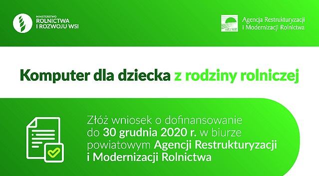 Więcej informacji na stronie: https://www.arimr.gov.pl/aktualnosci/artykuly/pieniadze-na-zakupu-komputera-dla-dziecka-z-rodziny-rolniczej.html