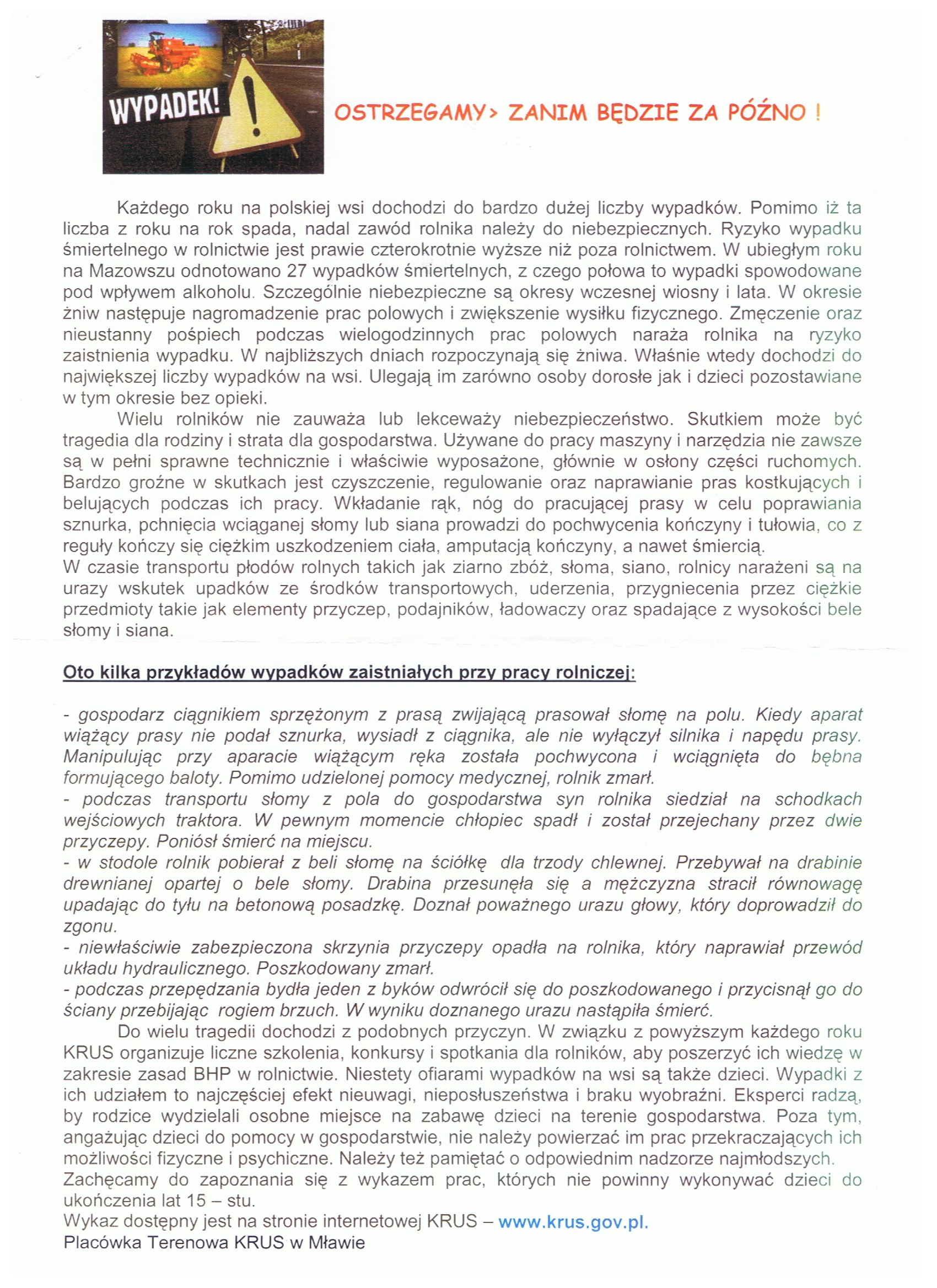 Trwa okres wzmożonych sezonowych prac przy zbiorze zbóż i innych płodów rolnych. Latem osoby pracujące w rolnictwie są narażone na zwiększone ryzyko wypadków, z powodu dużego natężenia prac, związanych z nim pośpiechem i wysiłkiem fizycznym, warunkami pogodowymi.
